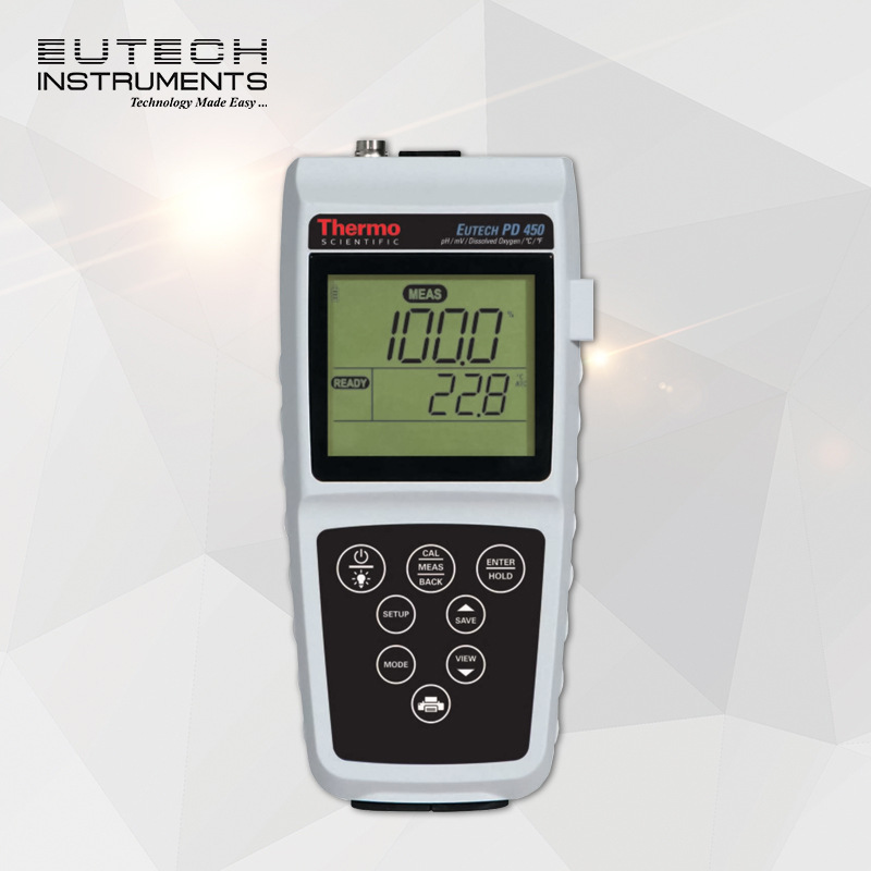 Eutech™ PD450 测量仪是一款测量 pH 值、mV、溶解氧和温度的多参数测量仪。经济实惠的光学 RDO 技术减少了维护时间和成本。不含电解质的免维护光学探头免去了更换精细薄膜的麻烦,也避免了在重新加注溶液过程中积聚盐分。您还可以在 pH 值、mV、饱和度% 和 mg/L (ppm) 溶解氧之间轻松切换 – 只需按一下按钮。