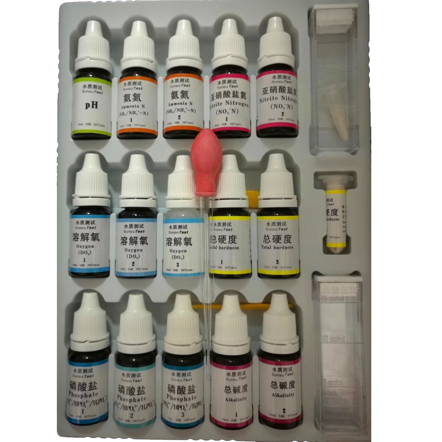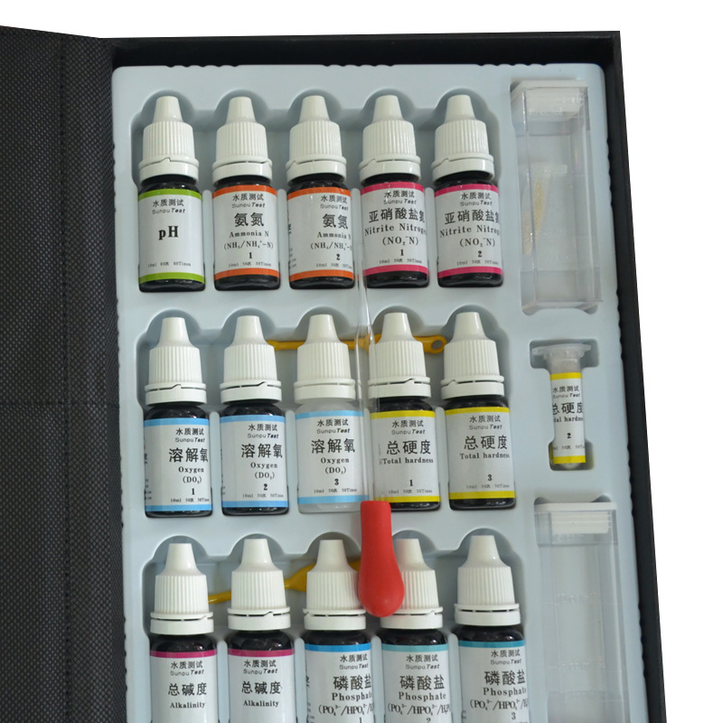 【试剂规格】PH值试剂1瓶、氨氮试剂2瓶、亚硝酸盐试剂2瓶(粉剂1瓶),磷酸盐试剂3瓶,总碱度试剂2瓶,总硬度试剂2瓶(粉剂1瓶),共7项指标。