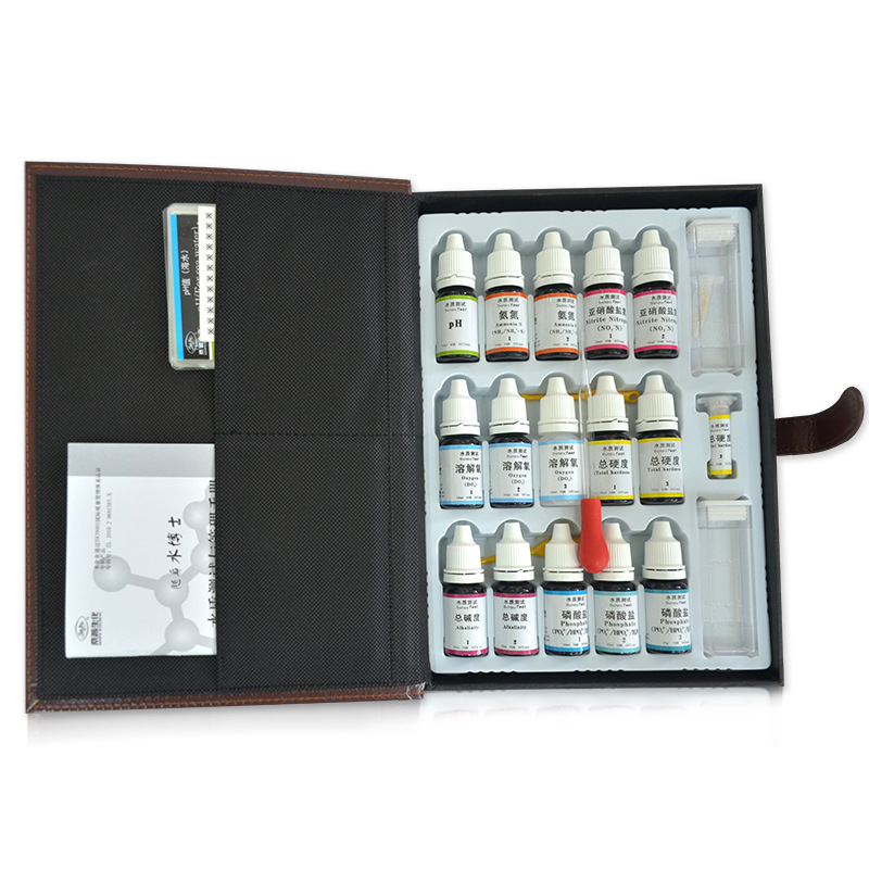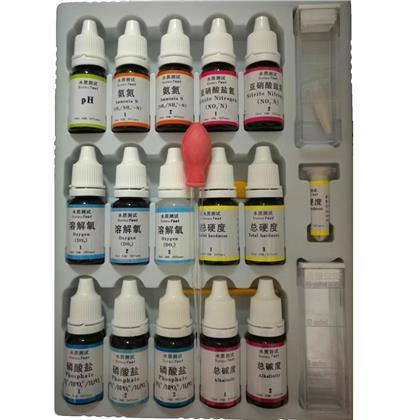 本品分为可测七项(pH值、氨氮、亚硝酸盐、溶解氧、磷酸盐、总碱度、总硬度)水质指标的套装;另有可测常规三项(pH值、氨氮、亚硝酸盐、)水质指标的套装;可测五项(pH值、氨氮、亚硝酸盐、溶解氧、硫化物)指标的精品装;测试单一指标的单项装,单项装包括上述八项及“余氯、COD、铜、镉”共12项指标。每种测试盒的单项测试指标均可测试50次,其中单项PH值测试盒可测试160次,单项余氯试盒可测试100次。