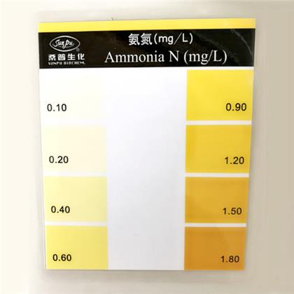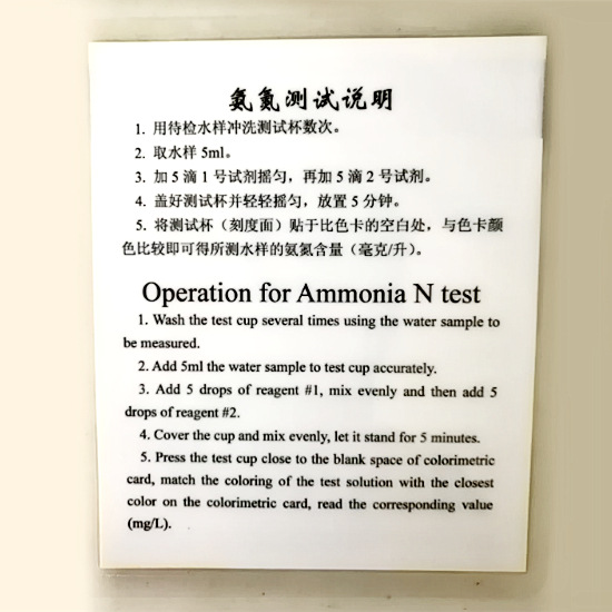 4.将测试杯(具刻度面)贴于比色卡的空白处,与比色卡颜色比较,即可得所测水样的氨氮含量(毫克/升)。